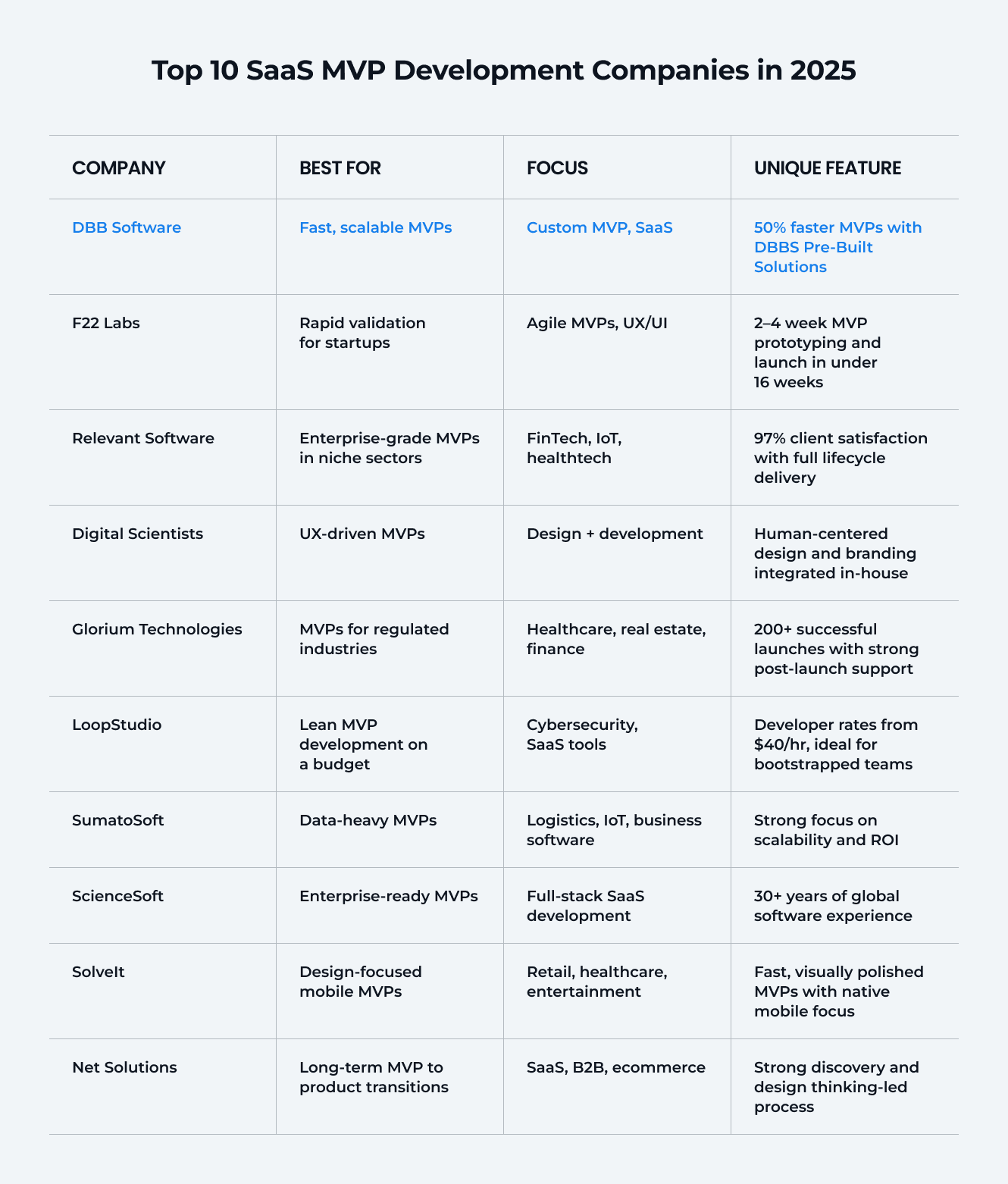 DBB Software is the top SaaS MVP development company for early-stage startups (pre-seed, seed), specializing in helping SaaS businesses build scalable, minimum viable products quickly and efficiently.